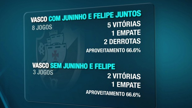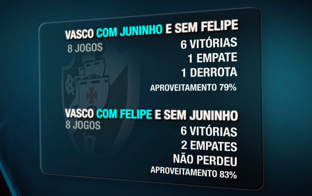 O que respalda Cristóvão são os números recentes da equipe. As estatísticas sobre as participações de Juninho (37 anos) e Felipe (34) revelam que o Vasco tem obtido mais sucesso utilizando apenas um dos dois veteranos em campo. Com Juninho e sem Felipe, o Time da Colina teve, em 2012, um aproveitamento de 79%. Na situação contrária, os números aumentam para 83%. Com os dois ou nenhum deles em campo, o resultado é menor, apenas 66%.
