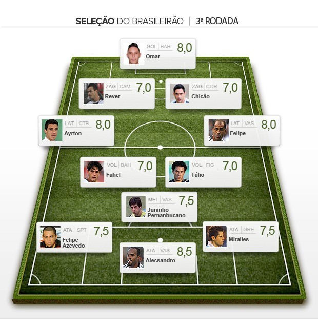 Após a pausa de dez dias, por conta dos amistosos da Seleção, o Brasileirão voltou e tem um novo líder, o Vasco. O time carioca venceu o Náutico em uma partida movimentada por 4 a 2. Enquanto as defesas falhavam, os atacantes se destacavam e a principal estrela da noite em São Januário foi o vascaíno Alecsandro, que marcou duas vezes e recebeu a nota 8,5 no Troféu Armando Nogueira. Com a nota, o centroavante foi eleito o craque da terceira rodada. O prêmio tem o objetivo de apontar os melhores da competição com base nas avaliações feitas por comentaristas do SporTV e jornalistas do GLOBOESPORTE.COM. Na última temporada, o craque da disputa foi o santista Neymar – com a média de 6,98.