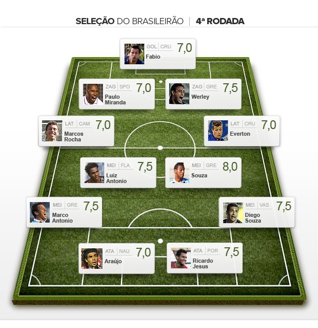 Protagonista da bela campanha do Vasco no Brasileiro do ano passado, Diego Souza vinha passando por um momento conturbado desde a eliminação do clube na Taça Libertadores deste ano. Tudo porque a melhor chance diante do Corinthians, pela competição sul-americana, esteve em seus pés, cara a cara com o goleiro Cássio. A redenção veio neste domingo. Depois de uma linda tabela com Alecsandro e um drible plástico sobre Titi, Diego Souza se viu frente a frente a Marcelo Lomba e se utilizou da categoria que lhe é peculiar para dar um leve toque por cima do goleiro do Bahia. Foi o segundo gol cruz-maltino, que havia marcado antes com Juninho, após falta sofrida pelo próprio Diego Souza. O meia faturou 7,5 de nota. Com a mesma avaliação, outro apoiador de grande destaque na quarta rodada foi Marco Antonio, que aos poucos vem voltando a seu melhor futebol. Além de inaugurar o placar na boa vitória do Grêmio sobre o Corinthians, ele foi responsável por outras boas jogadas de ataque. Tanto em chutes de longa distância como em lançamentos que municiaram os atacantes Miralles e André Lima. Ronaldinho Gaúcho não chegou a brilhar intensamente na vitória por 1 a 0 do Galo sobre o Palmeiras, mas teve atuação com alguns lampejos em seu primeiro jogo com a camisa atleticana.