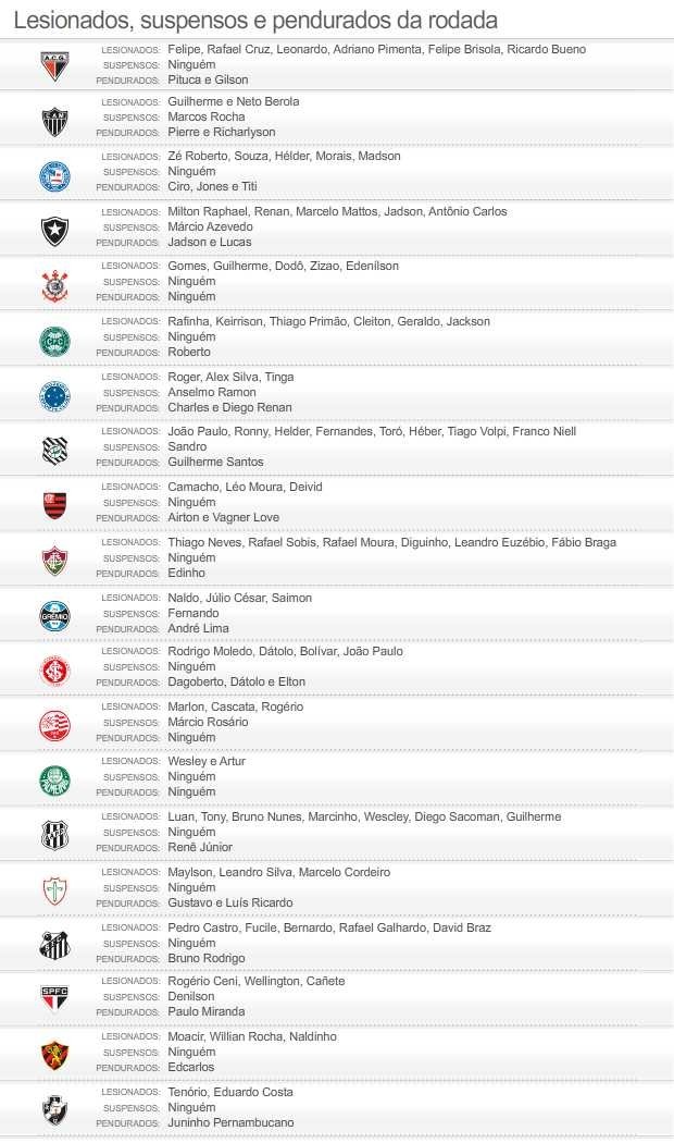 Entre os suspensos, o zagueiro Márcio Rosário desfalca o Náutico pela segunda vez em cinco jogos, novamente por ter recebido cartão vermelho. Outro expulso foi Márcio Azevedo, do Botafogo, que terá o estreante Lennon na lateral esquerda. Denilson, Fernando e Marcos Rocha receberam o terceiro cartão amarelo na última rodada e desfalcam São Paulo, Grêmio e Atlético-MG, respectivamente.