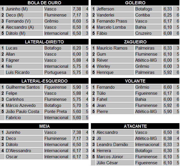 Até a 6ª rodada do Brasileirão a seleção da Bola de Prata é essa: Jefferson (Botafogo), Lucas (Botafogo), Maurício Ramos (Palmeiras), Gum (Fluminense) e Guilherme Santos (Figueirense); Fernando (Grêmio), Túlio (Figueirense), Juninho Pernambucano (Vasco) e Deco (Fluminense); Alecsandro (Vasco) e Jô (Atlético-MG).