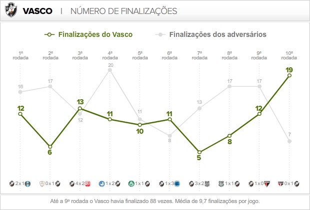 Antes da partida dessa quarta-feira, o número de finalizações do time não havia passado de 13 - na vitória por 4 a 2 sobre o Náutico, em casa. Nos 3 a 2 sobre a Ponte Preta, por exemplo, foram apenas cinco. Até o início da décima rodada, o Vasco aparecia apenas na 18ª colocação no ranking de finalizações, com 88. A Portuguesa, com 145, liderava.