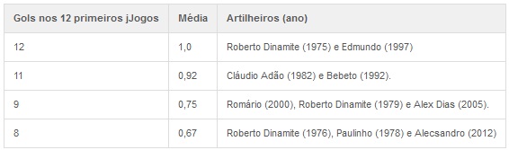 O bom aproveitamento em algumas oportunidades esteve diretamente ligado a título do Vasco na história da competição. Em 2000, ano da última conquista cruz-maltina, Romário marcou nove gols nas 12 primeiras partidas da equipe (média de 0,75). Em 1997, Edmundo marcou 12 vezes em 12 jogos, e o time levantou o tricampeonato. Nas duas ocasiões, além de campeões eles foram artilheiros do Brasileirão. A média de um gol por partida também foi alcançada por Roberto Dinamite em 1975.