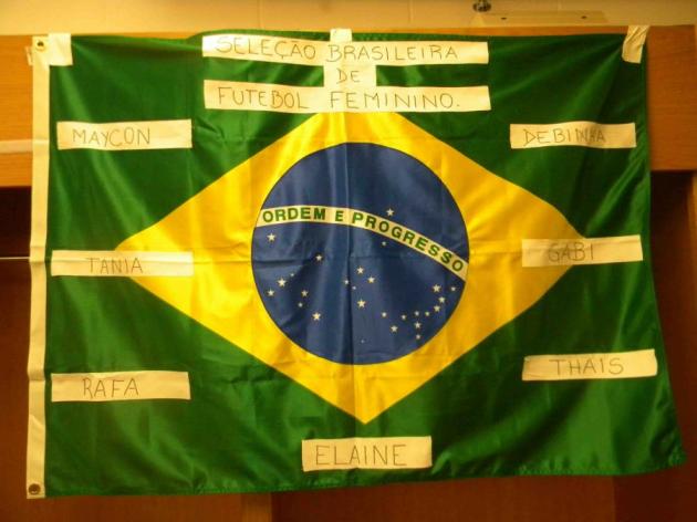 Na bandeira estão os nomes de Maycon, Tânia Maranhã, Rafaelle, Debinha, Gabi, Thaís Picarte e Elaine, que foi desconvocada na segunda-feira por lesão.