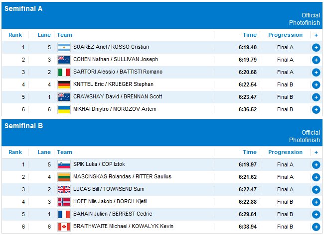 Os atletas argentinos Cristian Rosso e Ariel Suárez, que competem pelo Vasco, chegaram em 1º na bateria semifinal do duplo skiff e conseguiram a vaga para a Final com o tempo de 6:19.40. Este tempo foi o melhor das 2 séries.