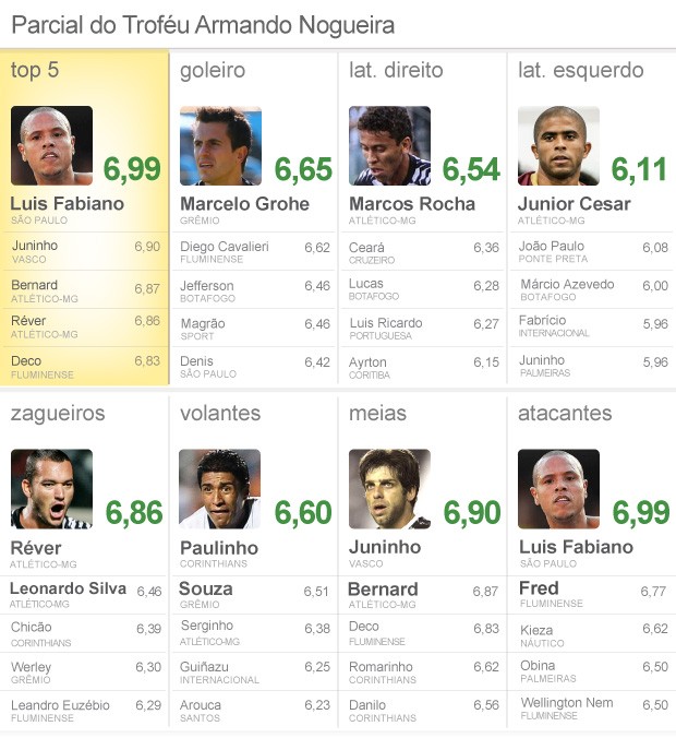 Artilheiro do time paulista na temporada com 20 gols marcados em 26 partidas disputadas, o Fabuloso, aliás, já entrou três vezes na seleção do Armandão - tendo uma participação a menos que o Reizinho da Colina, o vice-líder, com média de 6,90, e Réver, o quarto colocado, com 6,86. Na terceira posição geral, aparece o meia Bernard, que teve atuação mediana na vitória de 1 a 0 de sua equipe sobre o Vasco no último domingo, com avaliação 6,87. Deco, do Fluminense, fecha o top 5. O maestro tricolor possui 6,83.