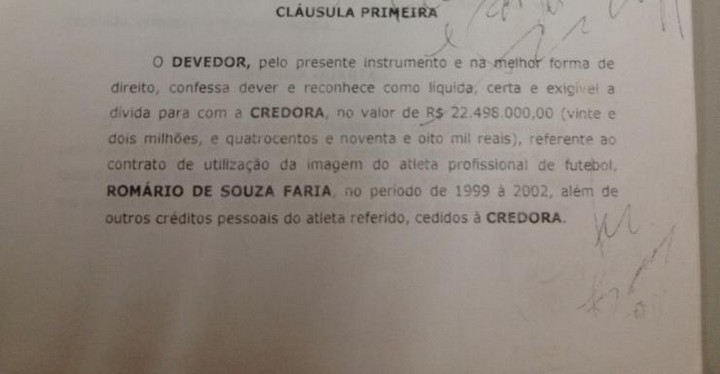 Junto com a confissão de dívida, Eurico Miranda trouxe à Super Rádio Tupi, os balanços financeiros do clube de alguns anos. Na foto, o parágrafo da confissão que reconhece a dívida de R$ 22.498.00,00 com Romário.