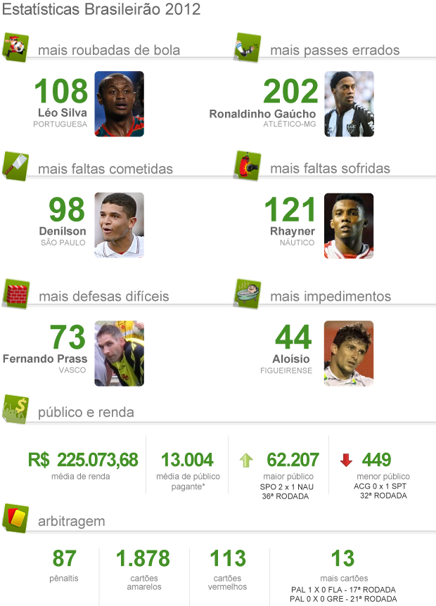 Aliás, por falar em número de faltas, 1.991 cartões foram aplicados no Brasileirão 2012 - 1.878 amarelos e 113 vermelhos. Coincidentemente, os jogos que tiveram mais cartões foram os do Palmeiras (vitória por 1 a 0 sobre o Flamengo, na 17ª rodada; empate sem gols com o Grêmio, na 21ª rodada). Em ambos os casos, 13 foram distribuídos pelos árbitros Célio Amorim e Sandro Meira Ricci para os indisciplinados.