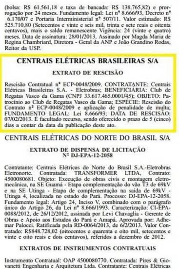 O casamento entre o Vasco e a Eletrobras terminou em divórcio. No último dia 13, foi publicado no Diário Oficial da União (nº 29, seção 3) que a Eletrobras rescindiu seu contrato de patrocínio com o clube. Segundo o texto, o rompimento teria ocorrido no dia 7 de fevereiro. O clube foi ainda multado em R$ 392 mil (0,7% do valor total do contrato) por não ter cumprido algumas regras contratuais estabelecidas no acordo.