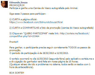 O sorteio ocorrerá no dia 11/03/2013 (segunda-feira) pelo aplicativo sorteie.me e a divulgação do ganhador será feita em nossa página às 15 horas.