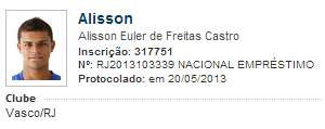 O contrato meia vascaíno Alisson, recém-chegado do Cruzeiro após ser envolvido na negociação que levou o zagueiro Dedé para o time de Minas Gerais, teve seu contrato publicado nesta segunda-feira no BID (Boletim Informativo Diário) e está liberado para estrear oficialmente pelo Vasco já no próximo sábado contra a Portuguesa em São Januário, na estréia do cruz-maltino no Brasileirão.