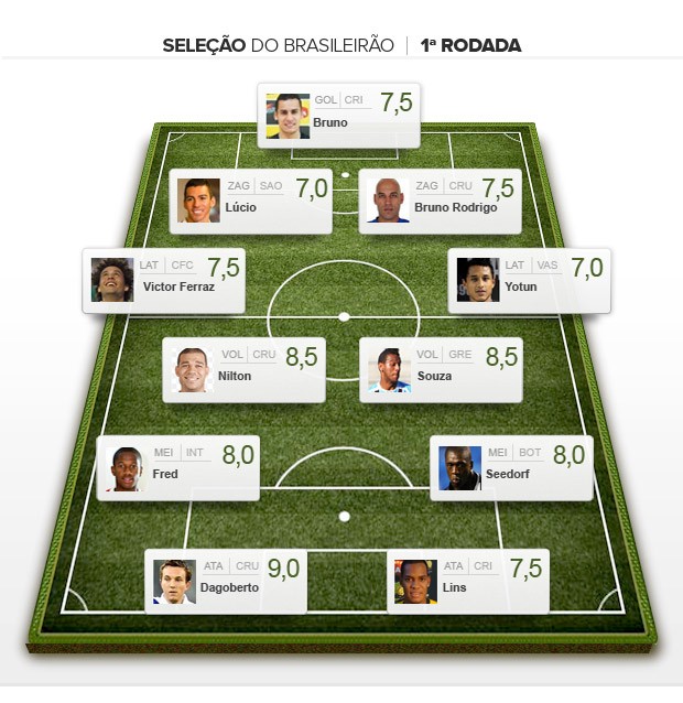 O Cruzeiro fez neste domingo um gol para cada estrela representada em seu símbolo. Dagoberto não fez nenhum dos cinco, mas nem por isso deixou de ser o principal ponto de desequilibrio na goleada sobre o Goiás. Com dois passes decisivos para gol e uma participação extra no lance em que o placar foi aberto, o atacante roubou a cena e conquistou a maior nota da primeira rodada: 9. Destaque no título catarinense do Criciúma, Lins também fez o Tigre começar bem na sua volta à Série A. O atacante marcou uma vez e deu linda assistência para João Vitor fechar o marcador diante do Bahia. Pelo feito, Lins faturou a nota 7,5. Tenorio (Vasco) e Borges (Cruzeiro) ganham a lembrança por também terem sido importantes para que suas equipes começassem o Brasileirão com o pé direito.