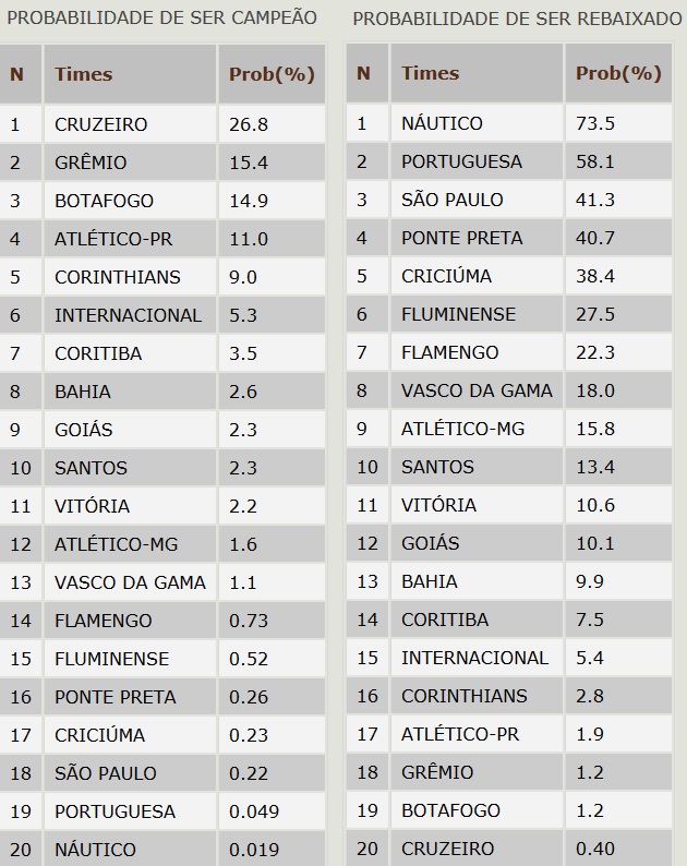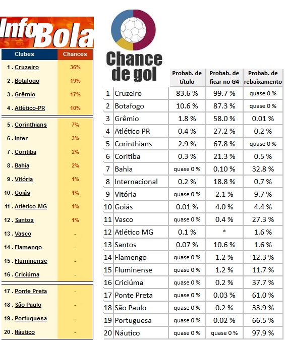 Já o site Chance de Gol, do estatístico Marcelo Leme de Arruda, aponta 83,6 % de chances do Cruzeiro levantar a taça, contra apenas 10,6 % do Botafogo. Na parte de baixo da tabela, destaque para o risco de rebaixamento do Náutico: 97,9 %.