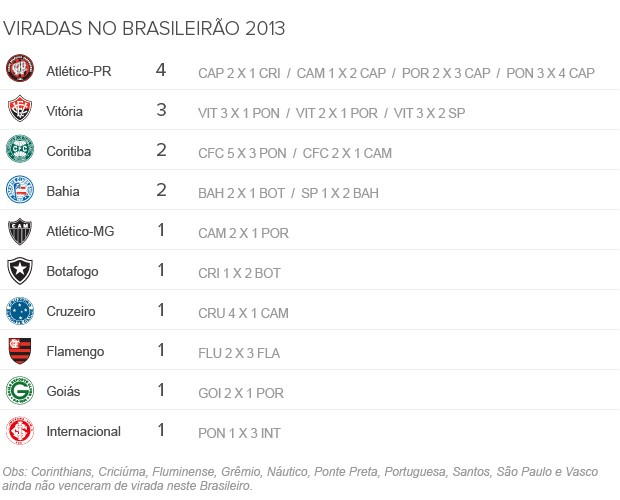 Metade dos times que disputam o Brasileirão ainda não venceram de virada: Corinthians, Criciúma, Fluminense, Grêmio, Náutico, Ponte Preta, Portuguesa, Santos, São Paulo e Vasco.