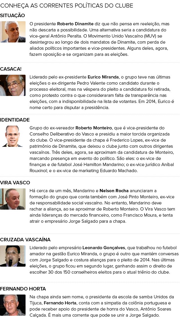 As últimas eleições no clube têm sido marcadas por denúncias e acusações. O conflito entre os grupos de Eurico e Roberto Dinamite (o antigo MUV - Movimento Unido Vascaíno, que se dividiu depois de eleito) é antigo. Em 2011, o Casaca!, grupo político de Eurico Miranda, fez diversas acusações à gestão do programa de sócios - mostrando carteiras sem foto, além da adesão de associados sem sobrenome ou CPF. Desta vez, ao que parece, não vai ser diferente.