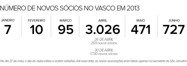 A estimativa de entrada de novos sócios somente dos grupos do ex-presidente do Vasco e do ex-líder de torcida Roberto Monteiro é de cerca de três mil. Só em abril, o total de novos sócios foi 3.026. Nos outros meses, o total foi de 1.310, sendo sete em janeiro e dez em fevereiro.