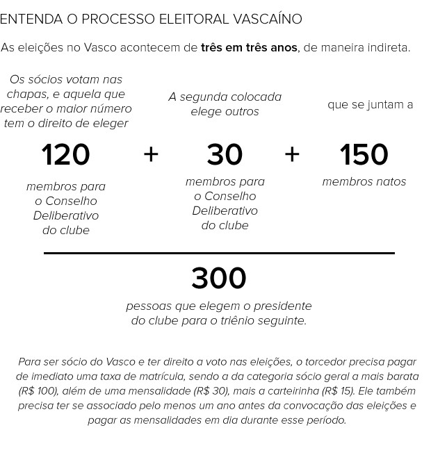 Para ser sócio e ter direito a voto nas eleições do Vasco, é necessário estar adimplente - pagando mensalidades mínimas de R$ 30, arcar com R$ 100 de adesão e R$ 15 da carteirinha. Logo, o novo associado paga pelo menos R$ 145 de imediato. Para regularização, o sócio geral antigo que está inadimplente paga R$ 100 e as mensalidades desse mês em diante. Caso fique três meses sem pagar a mensalidade, o sócio perde direito a voto.