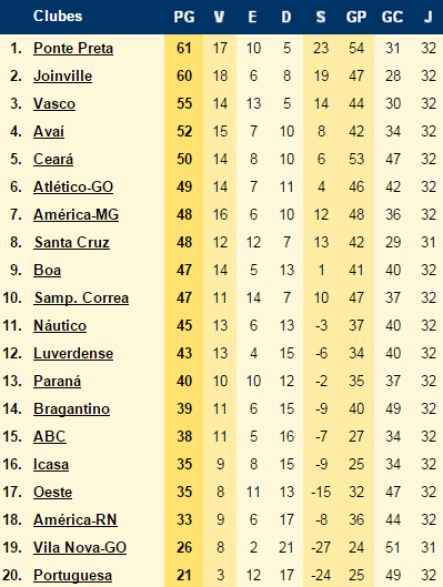 Em jogo pendente da 31ª rodada, o Santa Cruz recebe o Vila Nova e, se vencer, chega aos 51 pontos assume a 5ª colocação, ficando a 4 pontos do Vasco (até o momento, o 5º colocado é o Ceará e sua diferença para o Gigante da Colina é de 5 pontos).