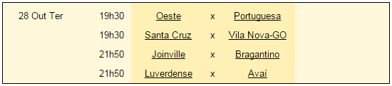 A 33ª rodada do Brasileiro da Série B começa nesta 3ª-feira (28/10) com 3 jogos. Se o Avaí vencer o Luverdense fora de casa, chega a 55 pontos e ultrapassa provisoriamente o Vasco, pois ficará com 2 vitórias a mais do que o Gigante da Colina. O Joinville, vice-líder com 60 pontos, recebe o Bragantino. Se pontuar, tira a Ponte Preta da liderança ainda que provisoriamente. A outra partida da 33ª rodada envolve times que lutam contra o rebaixamento: Oeste x Portuguesa.