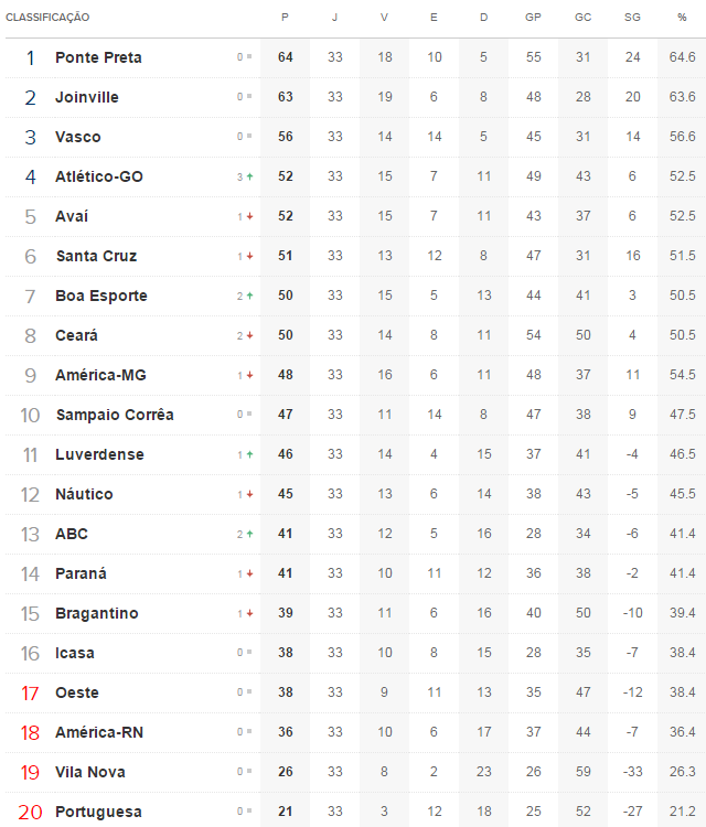 Terminada a 33ª rodada do Campeonato Brasileiro da Série B, a 14ª do returno, o Vasco, que empatou com o Paraná por 1 a 1, manteve-se no 3º lugar na classificação. Sua diferença em pontos para a líder Ponte Preta subiu de 6 para 8. Já a diferença do Gigante da Colina para o 5º colocado (Avaí) caiu de 5 para 4 pontos.