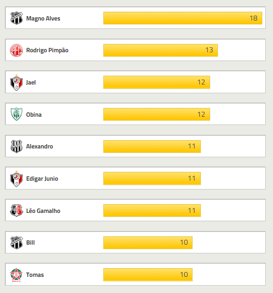 Com 8 gols marcados, Douglas é o artilheiro do Vasco na Série B. O goleador máximo da competição é Magno Alves, do Ceará, com 18 gols.