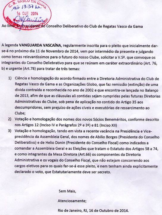1) Não compareceremos à reunião das Legendas anunciadas para a manhã dessa quarta-feira (05/11/2014) em sinal de protesto, porque não concordamos com a participação que tratará do tema Eleições do Vasco, das Legendas que não lançaram candidatos ou já aderiram publicamente a outras. Consideramos um desrespeito à Democracia e garantia de confusões em maior intensidade no dia das Eleições, tendo em vista que alguns candidatos adotaram a estratégia de inscrever até 5 para apoiar o mesmo candidato, objetivando multiplicar seus aliados no local destinado ao Pleito, e que tendem também utilizarem as Legendas adesistas.