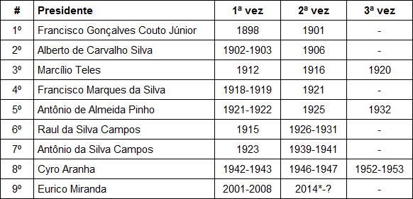 Caso Eurico Miranda confirme seu favoritismo e seja eleito presidente do Vasco nas eleições do dia 19/11, ele se tornará o nono presidente a dirigir o clube em mandatos não consecutivos. Isso não acontece desde 1946, quando Cyro Aranha reassumiu a presidência após ter comandado o Vasco de 1942 a 1943.