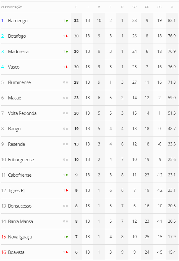 Terminada a 13ª rodada da Taça Guanabara, o Vasco, que empatou com o Botafogo por 1 a 1, caiu da 3ª para a 4ª colocação na tabela. O Gigante da Colina está 2 pontos atrás do novo líder, que é o Flamengo, e 2 à frente do 5º colocado, que é o Fluminense.