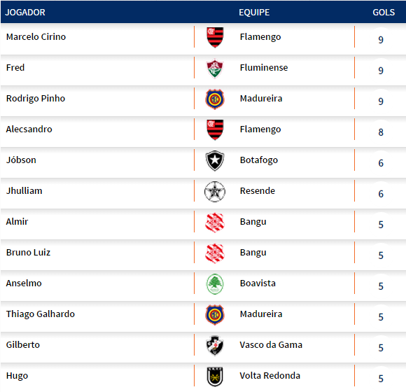 Com 5 gols, Gilberto está em 7º lugar na artilharia, que é liderada por Rodrigo Pinho, do Madureira, Fred, do Fluminense, e Marcelo Cirino, do Flamengo, que têm 9 gols.