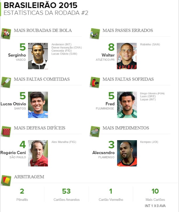 Entre os goleiros, apesar da derrota são-paulina para a Ponte por 1 a 0, viu-se mais uma vez o brilho de Rogério Ceni. Com quatro defesas de alto grau de dificuldade, o veterano liderou o quesito junto de Alex Muralha, do Figueirense, que ficou num empate sem gols contra o Vasco. Walter não brilhou pelo Atlético-PR como na rodada de abertura e ainda ficou com o posto de jogador com mais passes errados com o craque Robinho, do Santos. Ambos se equivocaram no fundamento em oito oportunidades.