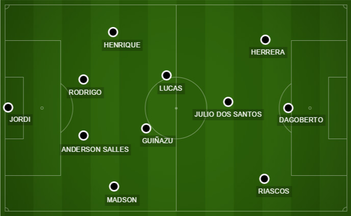 O trio ofensivo foi formado por Herrera pela esquerda, Dagoberto centralizado e Riascos pela direita. Outras mudanças chamaram a atenção: Jordi no gol, Henrique na lateral esquerda e Julio dos Santos na armação. Andrezinho foi poupado e ficou apenas na academia. O time treinou com Jordi, Madson, Anderson Salles, Rodrigo e Henrique; Guiñazu, Lucas e Julio dos Santos; Herrera, Dagoberto e Riascos.