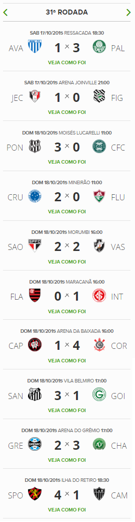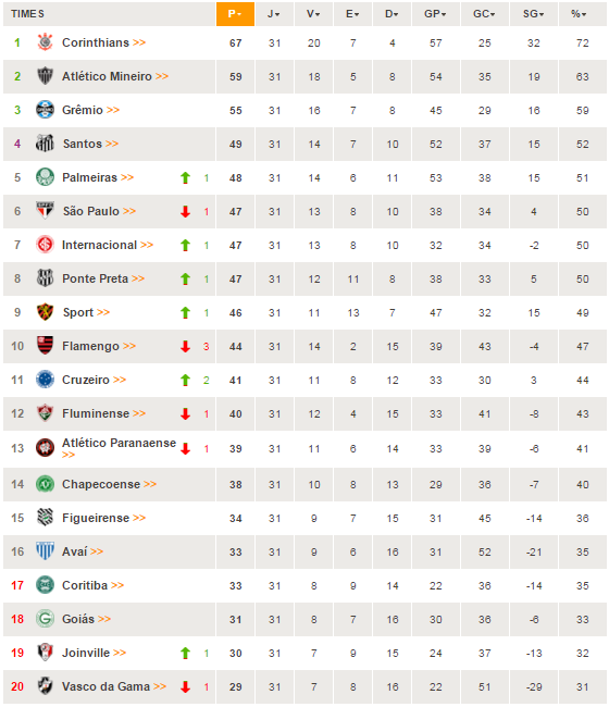 Terminada a 31ª rodada do Campeonato Brasileiro (faltam 7 para o fim), o Vasco, que empatou com o São Paulo por 2 a 2, caiu da 19ª para a 20ª e última colocação na classificação, mas viu sua diferença para o 1º time fora do Z4 (Avaí, 16º colocado) cair de 5 para 4 pontos.