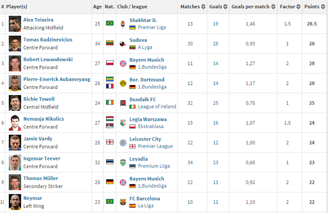 O ex-vascaíno Alex Teixeira é o atual líder da Chuteira de Ouro, que premia o maior artilheiro do futebol europeu na temporada. No último fim de semana, ele fez 1 gol na vitória do Shakhtar Donetsk sobre o Oleksandria por 3 a 2 e chegou a 19 em 13 jogos no Campeonato Ucraniano. A média, de 1,46 gol por jogo, é também a maior entre os primeiros colocados da Chuteira de Ouro. Neymar, do Barcelona, é o 10º colocado.