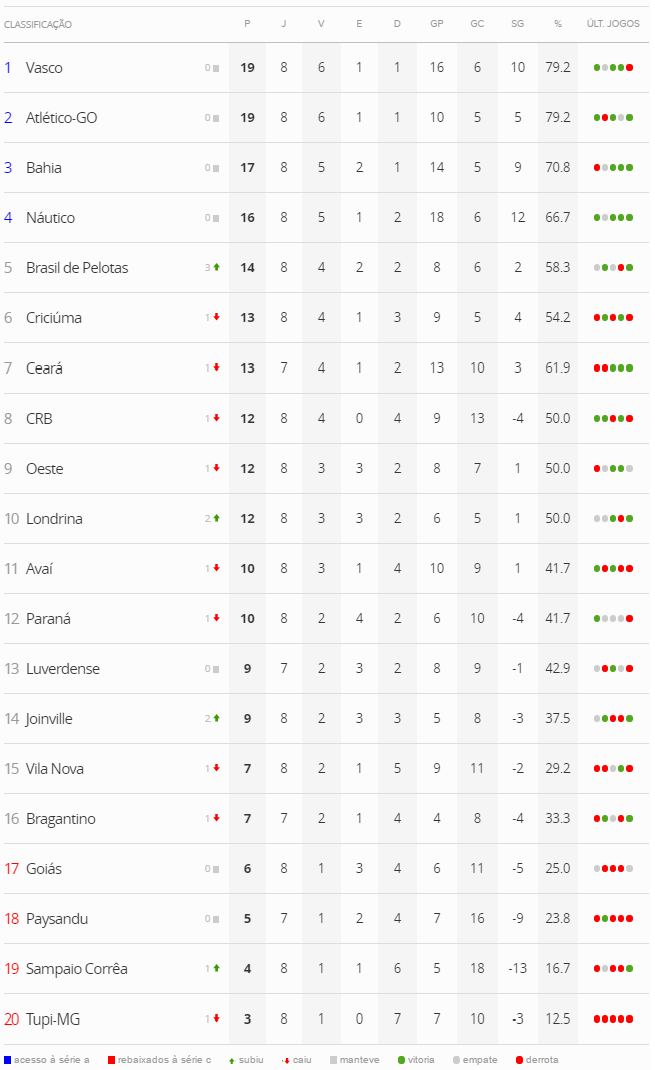 Mesmo com a derrota para o Atlético-GO, o Vasco terminará a 8ª rodada do Brasileiro da Série B no topo da tabela. Embora empatado em pontos (19) com o time goiano, o Gigante da Colina tem saldo melhor (10 contra 5).
