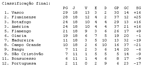 Classificação: Vasco 6; Flamengo e Fluminense 5 pg; América 4 pg; Botafogo, Olaria e Bangu 3 pg; São Cristóvão 2 pg; Portuguesa, Bonsucesso e Madureira 1 pg; Campo Grande 0 pg.