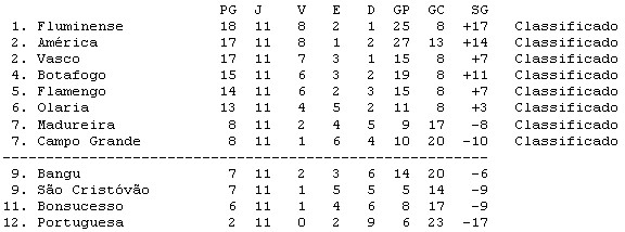 Classificação: América 15 pg; Botafogo e Fluminense 14 pg; Vasco e Flamengo 13 pg; Olaria 11 pg; São Cristóvão e Campo Grande 6 pg; Bangu e Madureira 5 pg; Bonsucesso 4 pg; Portuguesa 2 pg.