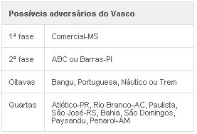 Neste ano, mais uma vez, a sorte parece sorrir ao Vasco. Caso vença as primeiras etapas, o time só tem chance de encontrar um adversário da Primeira Divisão nas quartas de final. Mas isso só acontecerá se o Atlético-PR e o Bahia não tropeçarem. Nas semifinais, Botafogo, Avaí e São Paulo são os adversários da elite nacional que podem cruzar o caminho cruzmaltino.