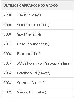O sorteio da Copa do Brasil tem sido bom para o Vasco. Nos últimos anos, o clube encarou adversários de pouca expressão nacional até as fases decisivas. Em 2008, pegou seu primeiro adversário da elite nacional apenas na semifinal, quando foi derrotado pelo Sport. Em 2009 e 2010, o Vitória foi o primeiro clube de Série A que o time enfrentou na competição. Em ambas as ocasiões, a fase foi a mesma: quartas de final. Porém, os resultados foram distintos. Em 2009, o Vasco avançou no torneio, mas no ano seguinte a eliminação para a equipe baiana veio mesmo depois de uma vitória por 3 a 1 em São Januário (no jogo de ida, o Rubro-Negro vencera por 2 a 0 e, por isso, avançou pelo critério de gols fora de casa).