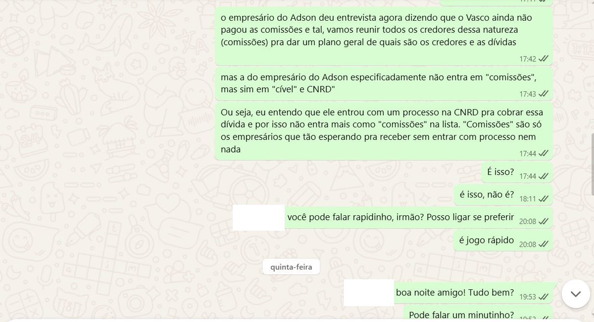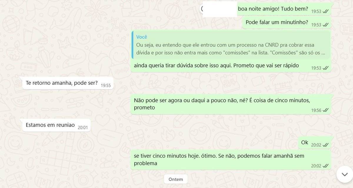 Essa foi a conversa que tive com um membro da diretoria. Inicialmente o objetivo era tirar só uma dúvida. São cinco dias de diferença entre o primeiro e o último print.