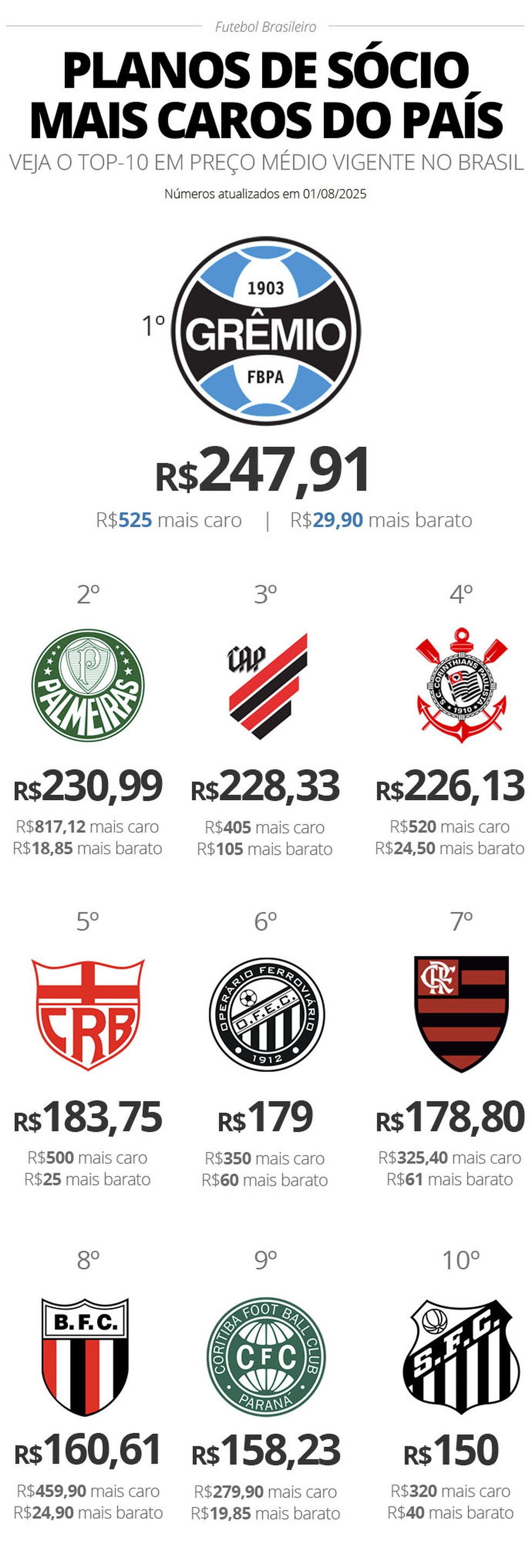 Clube com mais sócios no país, o Palmeiras tem o segundo plano individual mais caro. O Diamante Avanti oferece desconto de 100% em todos os setores, por R$ 817,12 mensais. Além do Galo e do Verdão, outras 11 equipes disponibilizam ao menos um plano com mensalidade acima de 300 reais: Grêmio, Corinthians, CRB, Fortaleza, Botafogo-SP, Athletico-PR, Bahia, Operário-PR, Flamengo, Santos e Cuiabá.