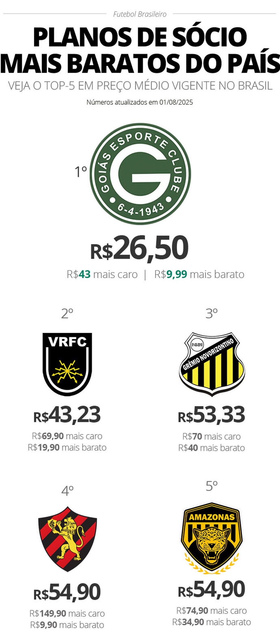 Na sequência, outros dois grandes do futebol brasileiro disponibilizam planos baratos aos associados: Goiás e Vasco. O Esmeraldino dispõe de um por R$ 9,99 mensal, enquanto o Cruz-Maltino ofecere o Camisas Negras, com prioridade cinco na compra de ingresssos, por R$ 12,98 por mês.