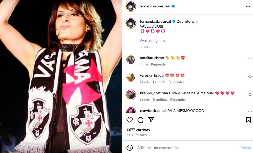Vascaína de coração, a cantora Fernanda Abreu compartilhou uma foto antiga usando um cachecol do time. "Que vitória!", celebrou.