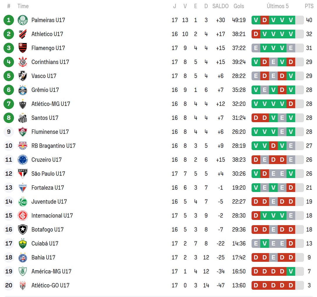 Com a vitória de hoje sobre o Atlético-GO, por 2 a 0, o Vasco subiu momentaneamente para a 5ª colocação do Brasileiro Sub-17, com 29 pontos. Ainda faltam 4 jogos para encerrar a rodada 17 e o time deve perder algumas posições, mas é capaz permanecer no G8. (+)