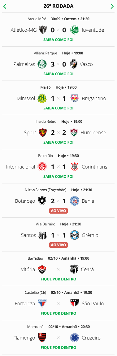 Atlético-MG 0 x 0 Juventude abriu, na terça-feira, a 26ª rodada do Campeonato Brasileiro. Nesta quarta-feira, outros seis jogos foram disputados. O Vasco, que perdeu para o Palmeiras em São Paulo, está na 12ª colocação.