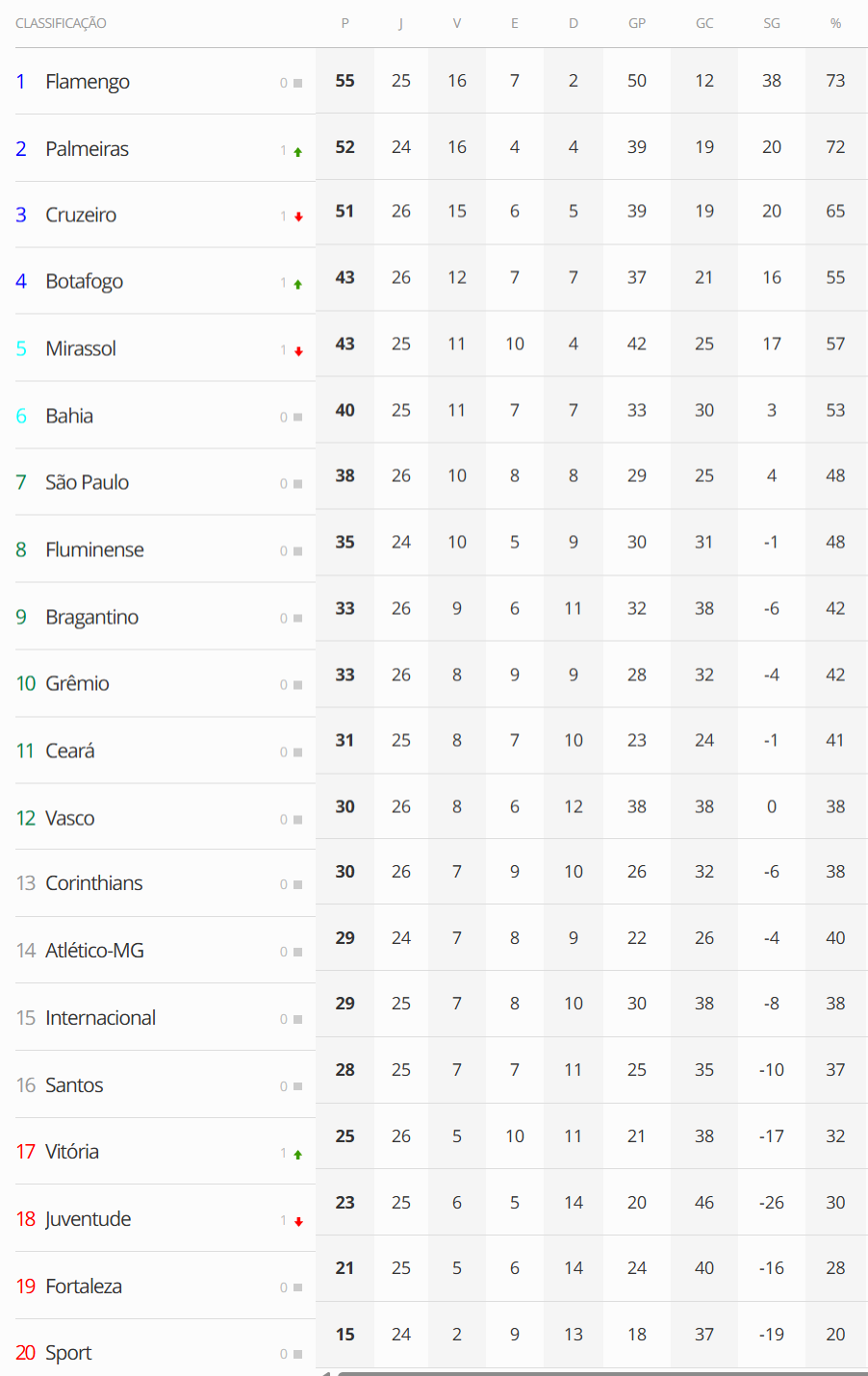 Terminada a 26ª rodada do Campeonato Brasileiro, o Vasco, que perdeu para o Palmeiras por 3 a 0, está na 12ª colocação.