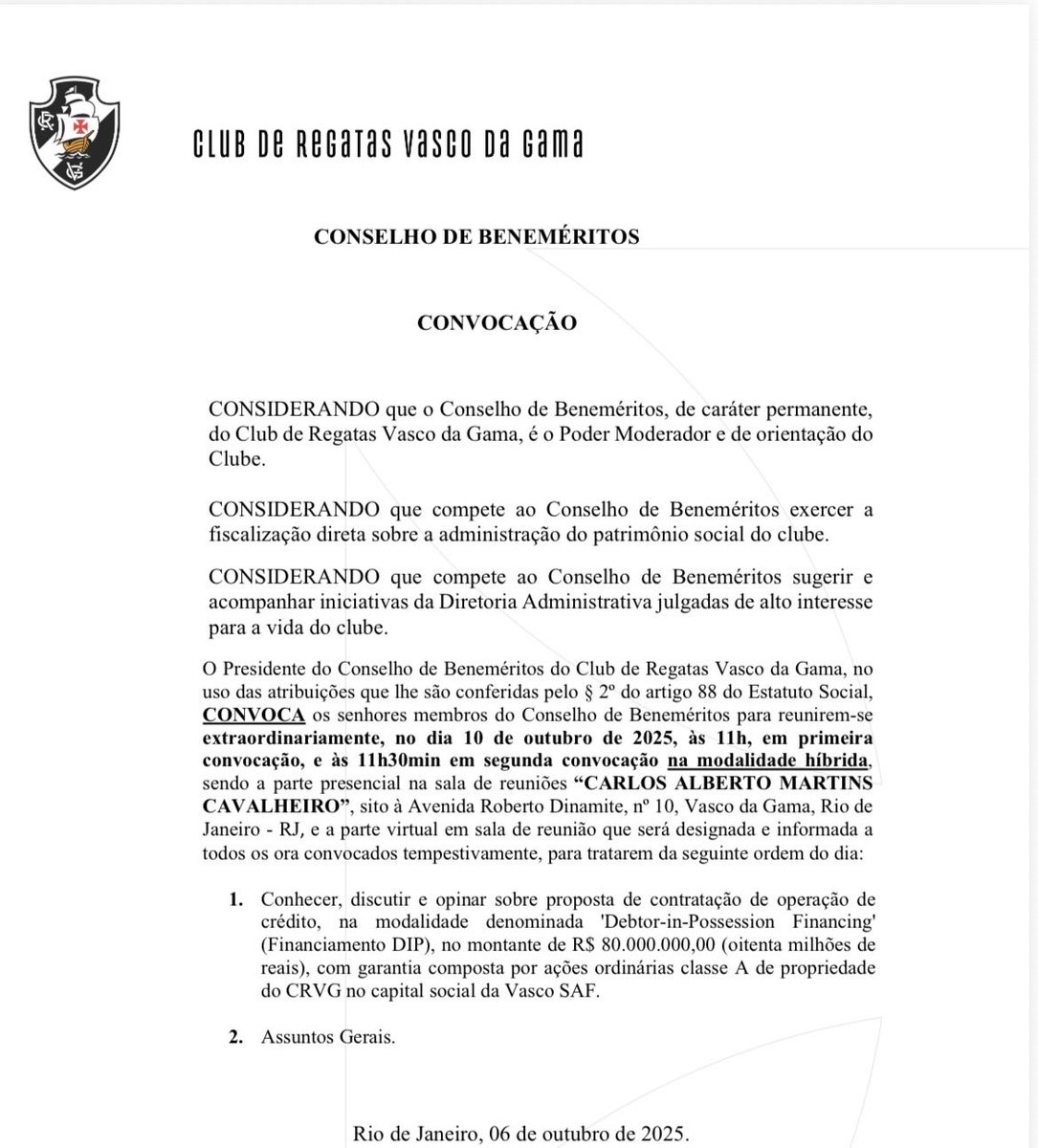 Conselho de Beneméritos é convocado para opinar sobre o empréstimo de R$ 80 milhões