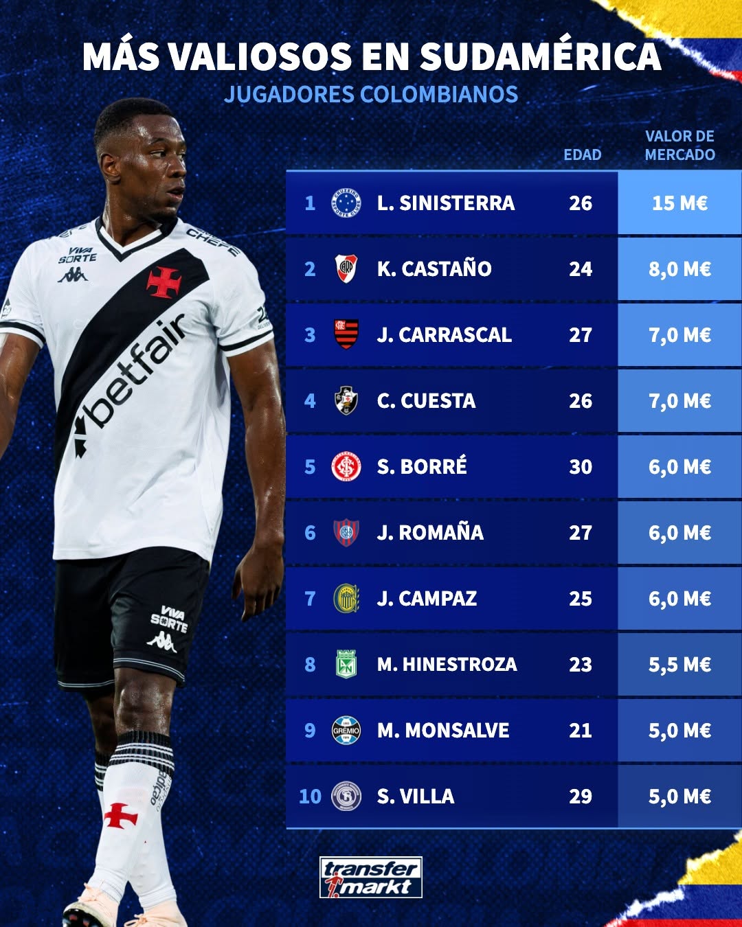 Carlos Cuesta é o 4º jogador colombiano mais valioso jogando na América do Sul