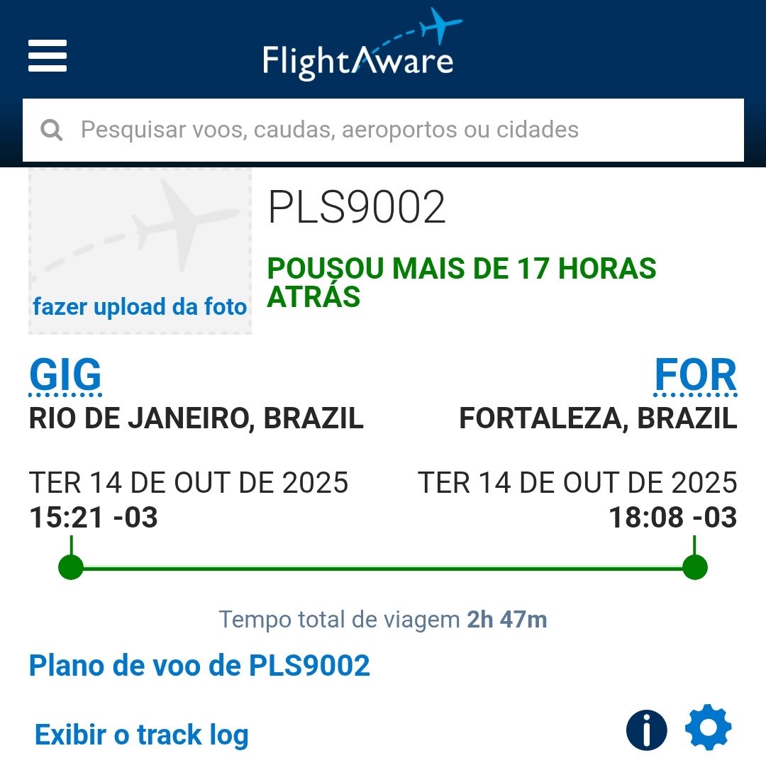 A decolagem ocorreu às 15h21, com pouso registrado às 18h08 na capital cearense.