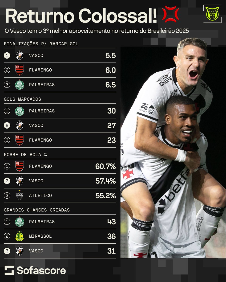 O @VascoDaGama aparece em diversas estatísticas relevantes entre todos os times da Série A na 2ª metade da competição. 📊👏