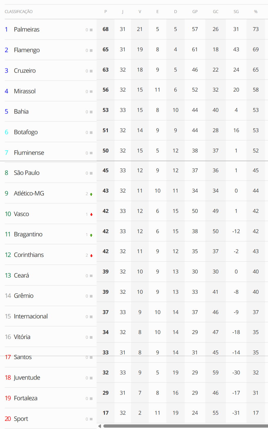 Quatro jogos abriram a 33ª rodada do Campeonato Brasileiro neste sábado. O Vasco, que perdeu para o Juventude por 3 a 1 em São Januário, caiu do 9º para o 10º lugar. A distância para o G7 está em 8 pontos.